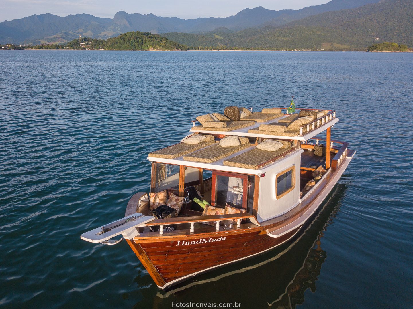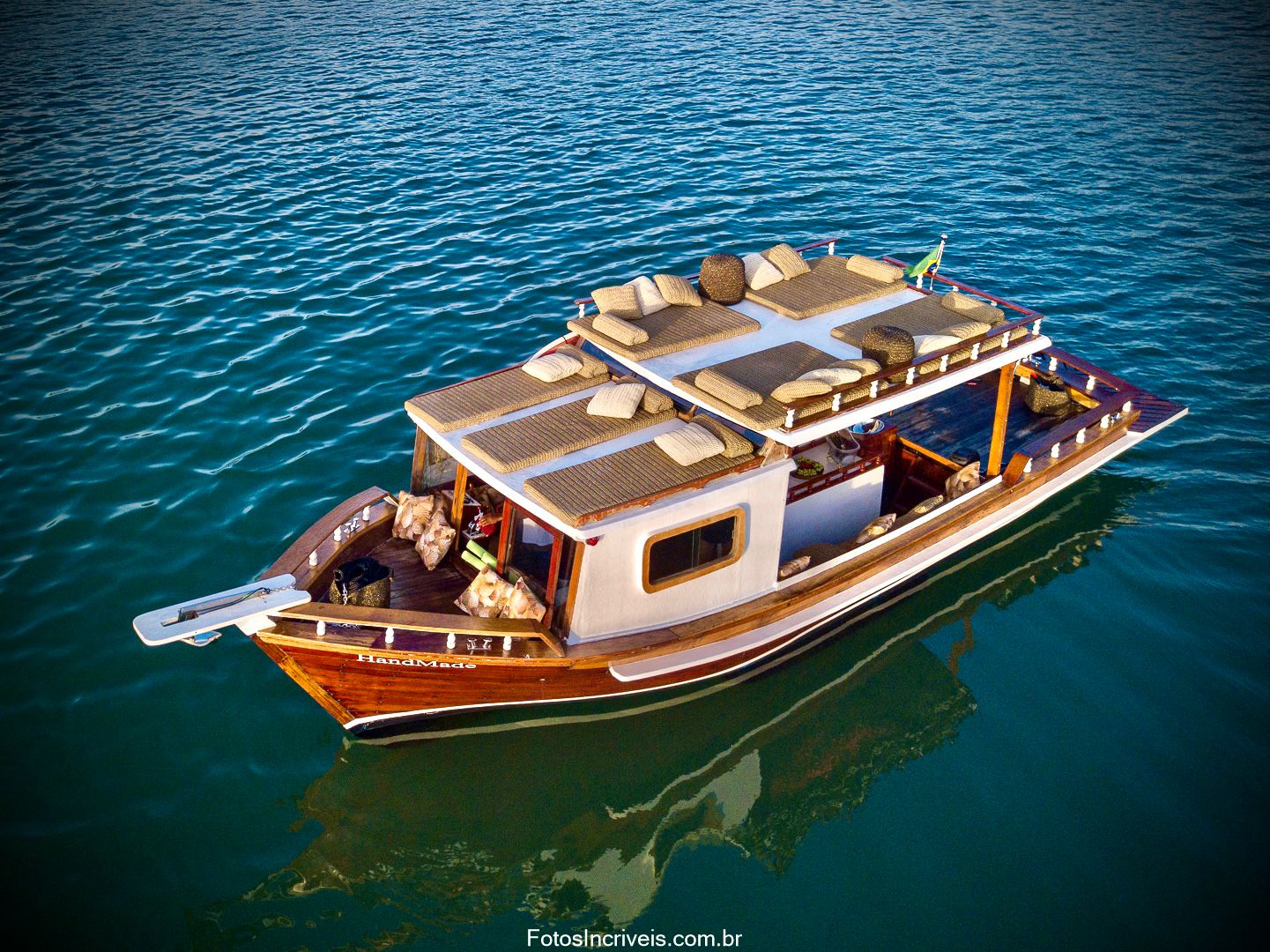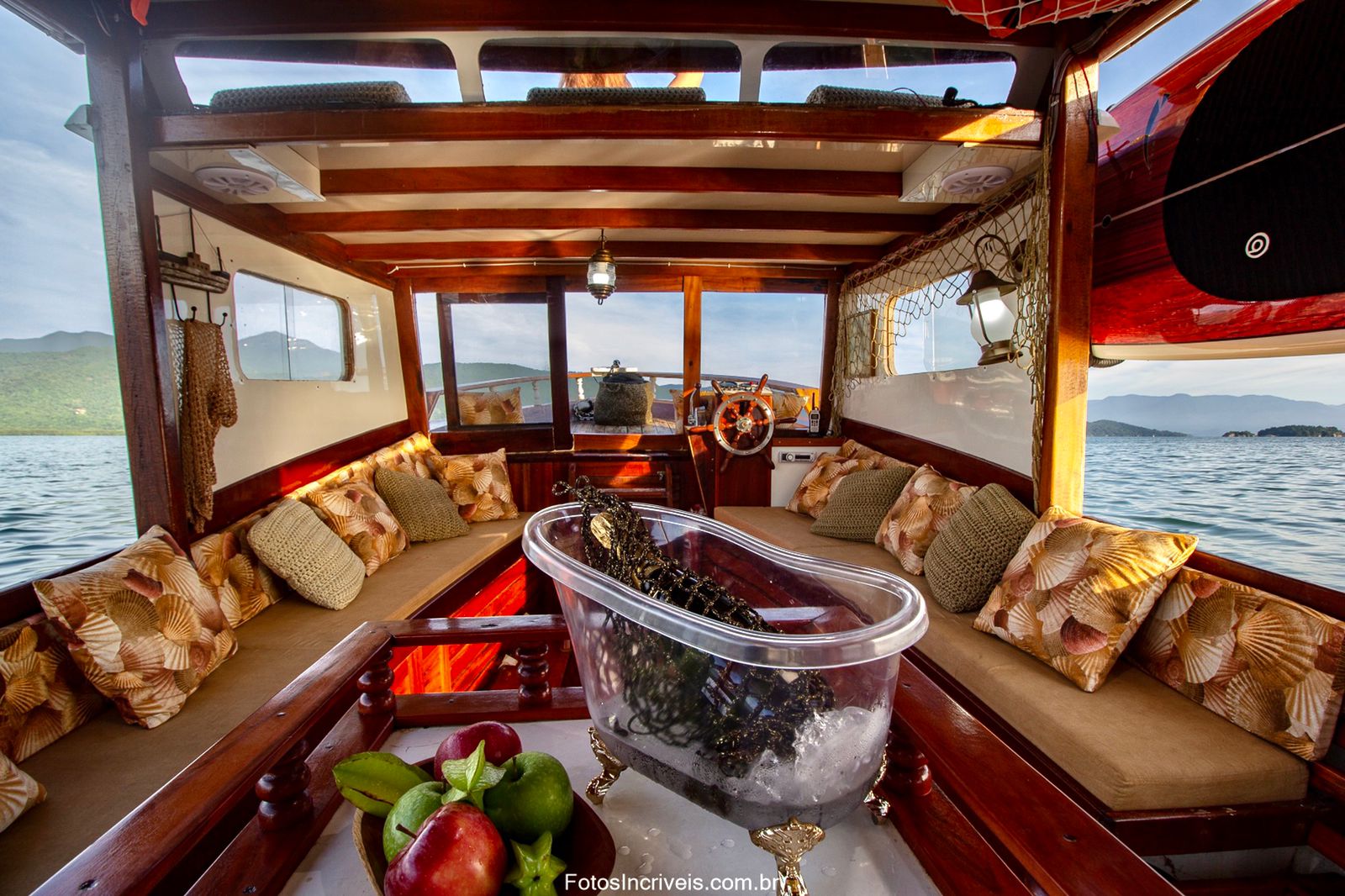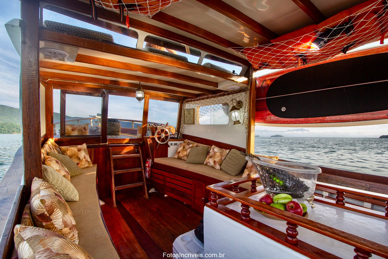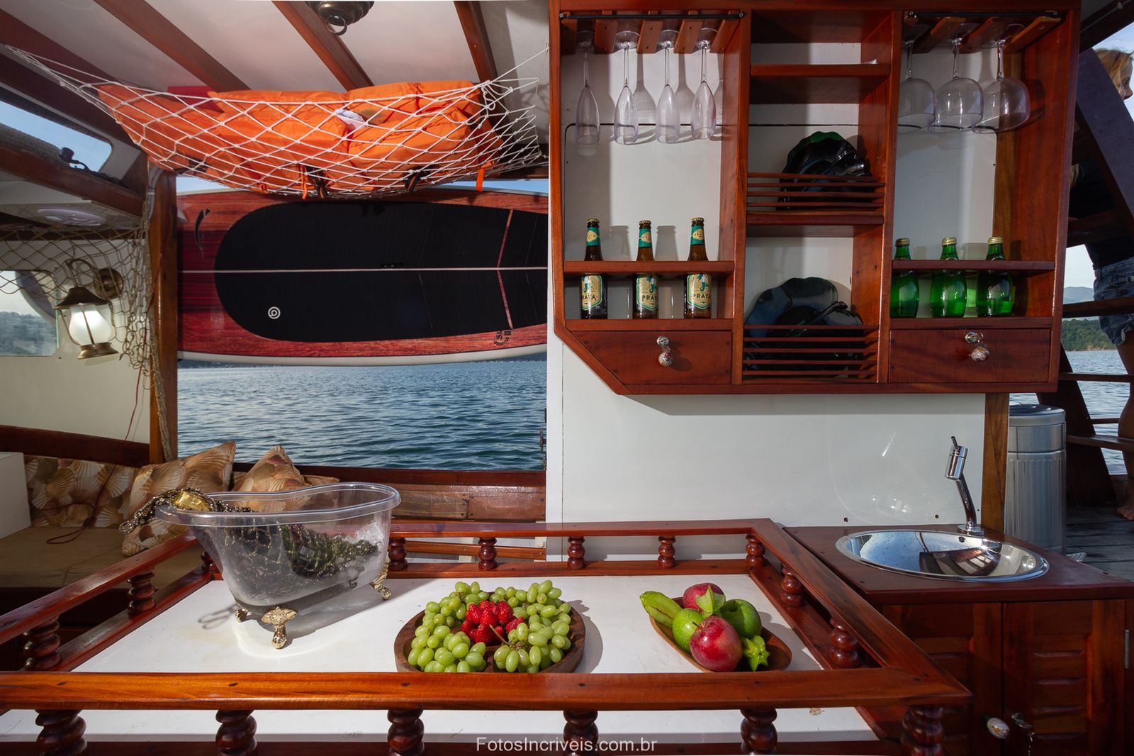 A embarcação oferece: Banheiro, Ducha com água doce, Stand Up, Toalhas, Caixa com gelo e frutas, coletes salva-vidas.
