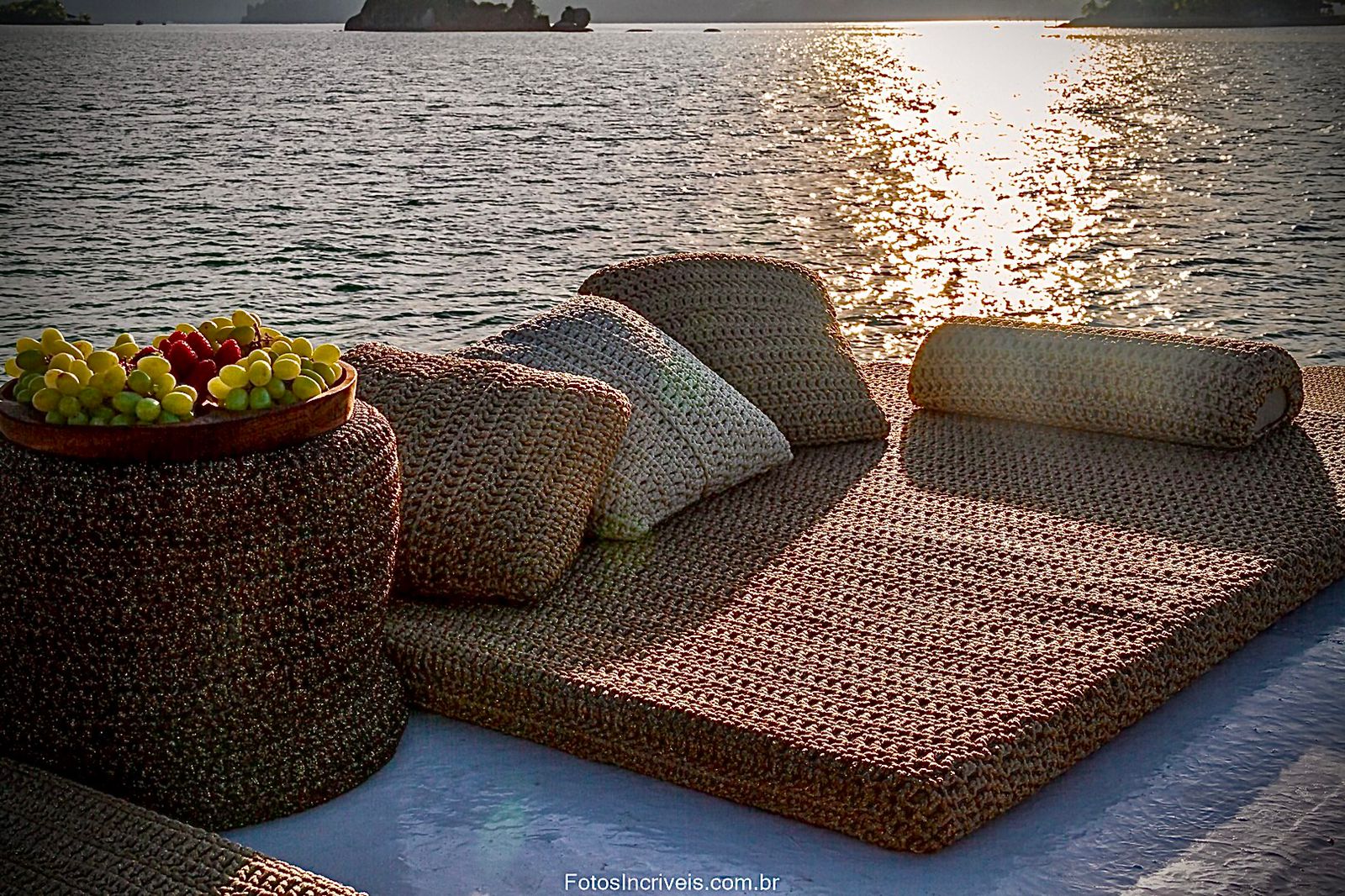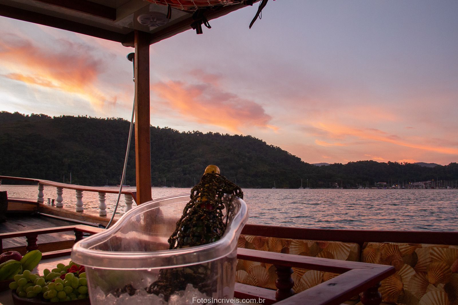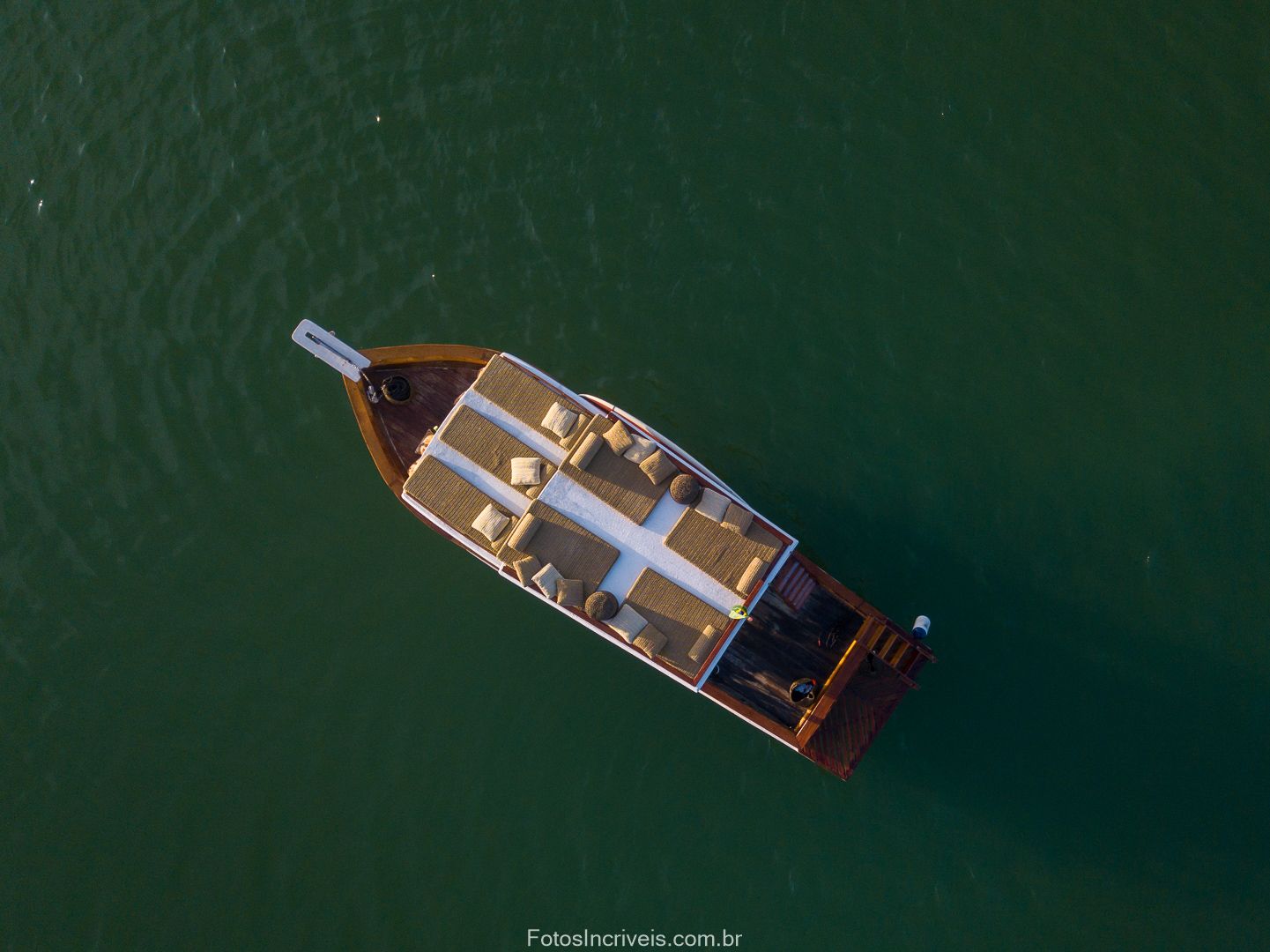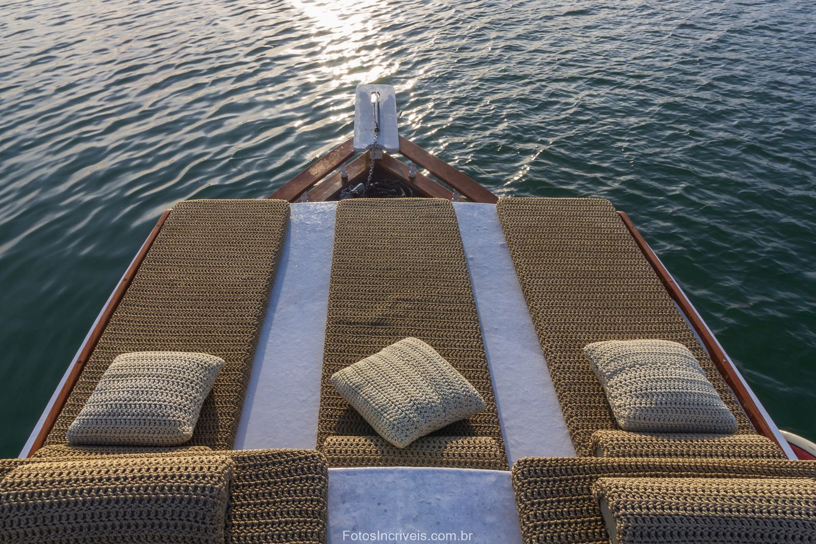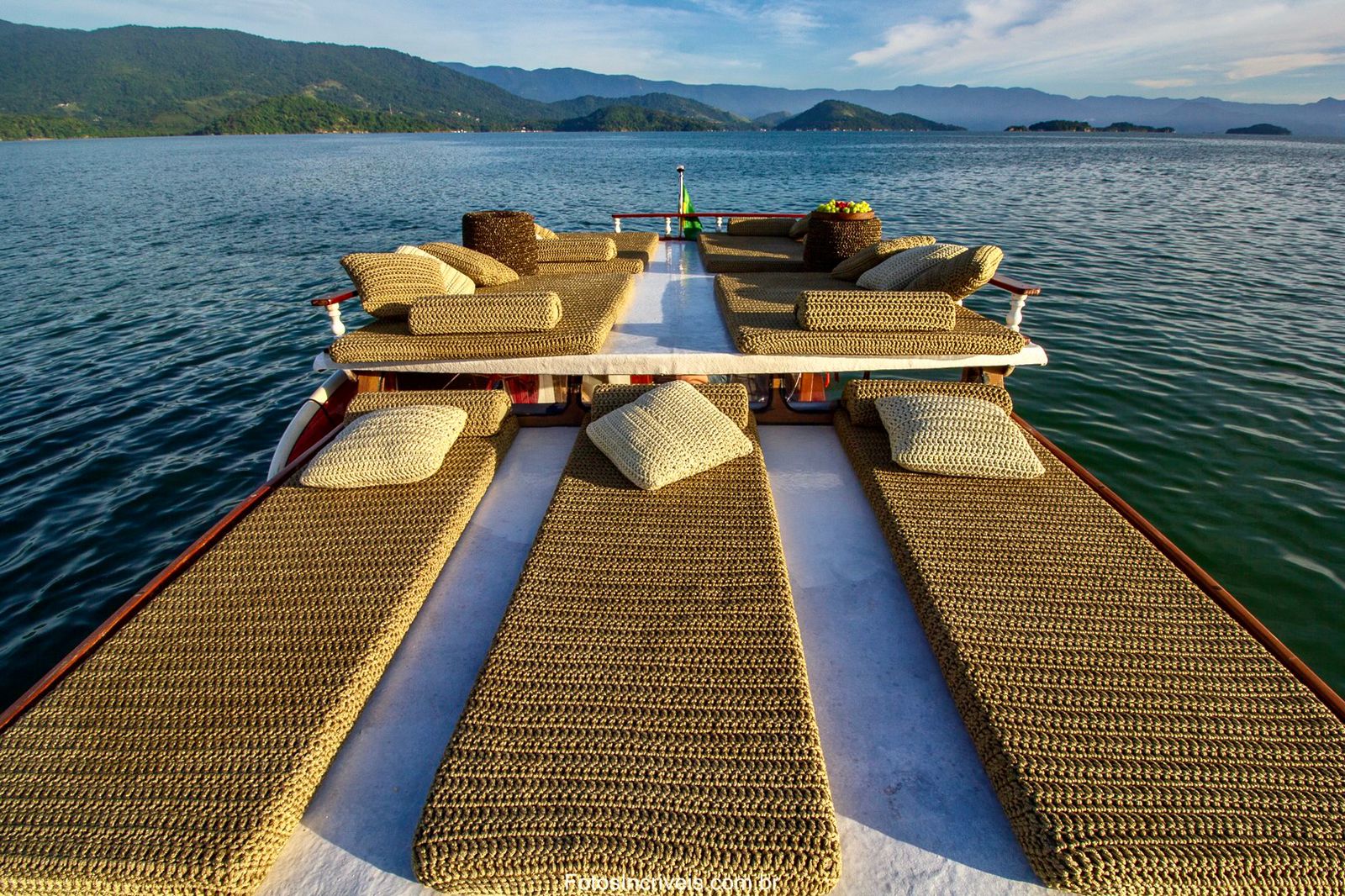 A embarcação oferece: Banheiro, Ducha com água doce, Stand Up, Toalhas, Caixa com gelo e frutas, coletes salva-vidas.